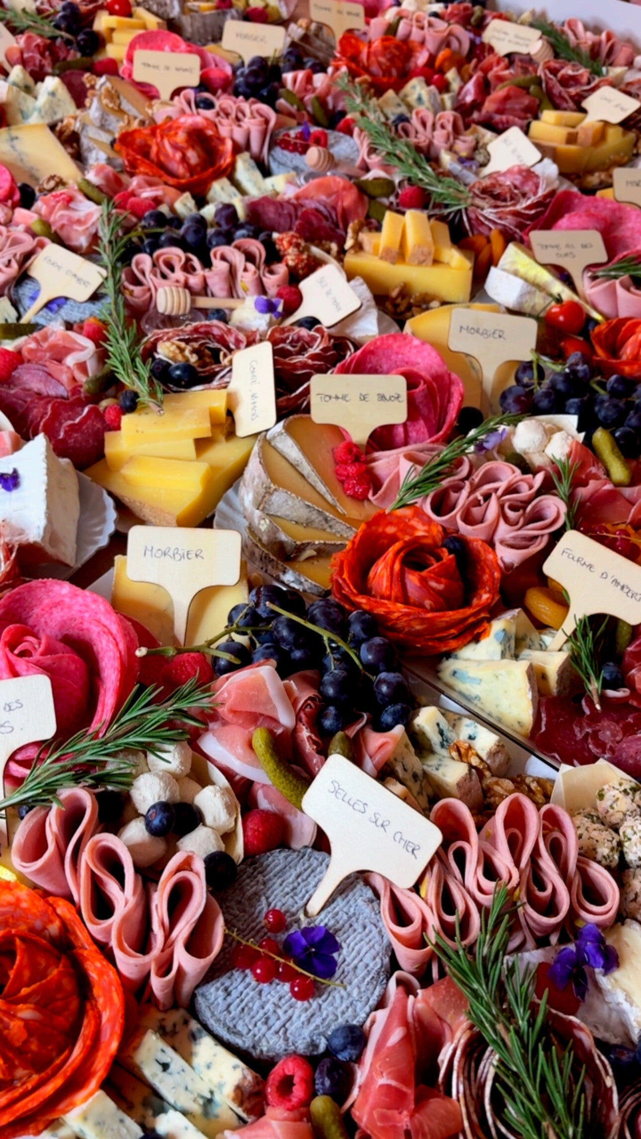 Le plateau charcuterie et fromage est composé d'un assortiment de charcuterie, de fromages de qualité, majoritairement AOP. Vient s'y ajouter des fruits frais, des fruits secs, des condiments... le tout travaillé de manière artisanale, avec des nuances de couleurs!